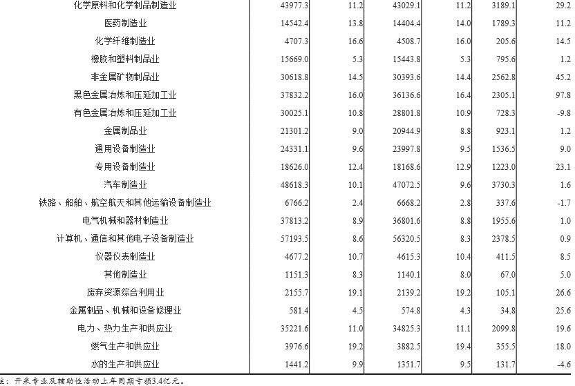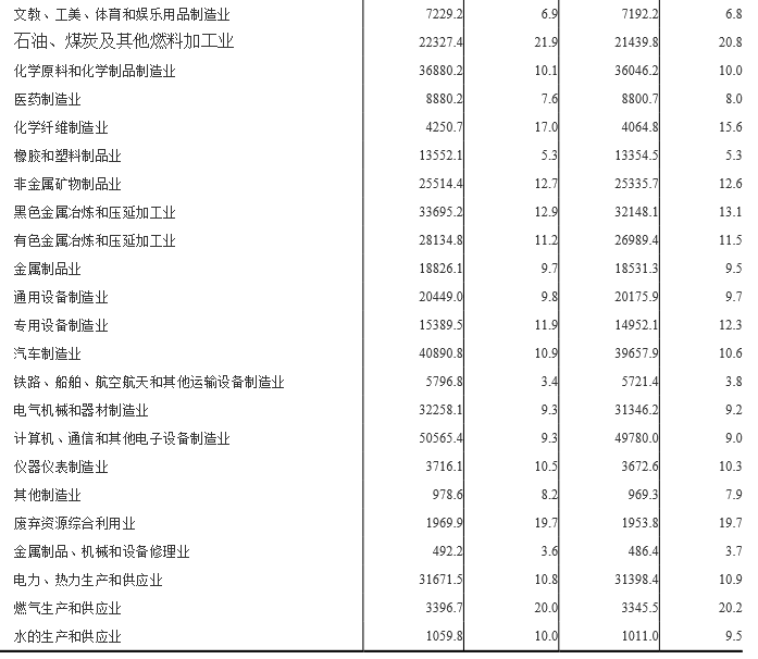 1-7月份,在41個(gè)工業(yè)大類行業(yè)中,32個(gè)行業(yè)利潤總額同比增加,9個(gè)行業(yè)減少。主要行業(yè)利潤情況如下:煤炭開采和洗選業(yè)利潤總額同比增長18%,石油和天然氣開采業(yè)增長4.5倍,農(nóng)副食品加工業(yè)增長1.4%,紡織業(yè)增長0.2%,石油、煤炭及其他燃料加工業(yè)增長36.1%,化學(xué)原料和化學(xué)制品制造業(yè)增長29.2%,非金屬礦物制品業(yè)增長45.2%,黑色金屬冶煉和壓延加工業(yè)增長97.8%,通用設(shè)備制造業(yè)增長9%,專用設(shè)備制造業(yè)增長23.1%,汽車制造業(yè)增長1.6%,電氣機(jī)械和器材制造業(yè)增長1%,計(jì)算機(jī)、通信和其他電子設(shè)備制造業(yè)增長0.9%,電力、熱力生產(chǎn)和供應(yīng)業(yè)增長19.6%,有色金屬冶煉和壓延加工業(yè)下降9.8%。