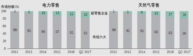 數(shù)字化和智能化將不斷挖掘能源企業(yè)成本降低和產(chǎn)業(yè)高效協(xié)同的潛力,創(chuàng)造市場(chǎng)營(yíng)銷和價(jià)值增長(zhǎng)的空間,催生日新月異的新平臺(tái)新模式,不斷賦予供給側(cè)結(jié)構(gòu)性改革以新的內(nèi)涵,甚至有些業(yè)務(wù)是我們現(xiàn)在還想象不到的。例如,數(shù)字化零售正在快速顛覆歐洲能源零售市場(chǎng),2012年英國(guó)新零售企業(yè)只占電力和燃?xì)饬闶凼袌?chǎng)份額的1%,短短5年時(shí)間,以O(shè)VOEnergy和OpusEnergy為代表的新零售企業(yè)的市場(chǎng)份額已經(jīng)增長(zhǎng)到20%左右,對(duì)英國(guó)六大傳統(tǒng)能源零售企業(yè)造成了顯著的擠出效應(yīng)(如圖所示)。類似的現(xiàn)象也正在德國(guó)等其他國(guó)家發(fā)生。