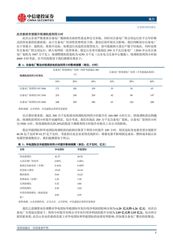 綜合而言,華電國(guó)際約有 852 萬千瓦裝機(jī)降價(jià) 1.1 分, 259.5 萬千瓦裝機(jī)降幅在 0.1 分至 0.5 分之間;華能國(guó)際約有 754 萬千瓦裝機(jī)降價(jià) 1.1 分, 444 萬千瓦裝機(jī)降幅在 0.004 分至 1 分之間。進(jìn)一步考慮降價(jià)對(duì)于兩公司營(yíng)收及業(yè)績(jī)的影響,我們假定利用小時(shí)為 4500 小時(shí),同時(shí)考慮山東統(tǒng)調(diào)機(jī)組計(jì)劃電量占發(fā)電量 53%( 18 年上半年數(shù)據(jù),假定 47%的市場(chǎng)電不受電價(jià)調(diào)整影響),結(jié)合上市公司對(duì)相關(guān)電廠的權(quán)益占比,測(cè)算結(jié)果如表 3 所示。 根據(jù)測(cè)算結(jié)果顯示,在相關(guān)假設(shè)下,華電國(guó)際和華能國(guó)際年化歸母凈利潤(rùn)影響分別為-1.20 億和-1.26 億。考慮到此次降價(jià)政策自今年 9 月 1 日起執(zhí)行, 華電國(guó)際和華能國(guó)際 18 年歸母凈利受損分別為-4000 萬元和-4200萬元。