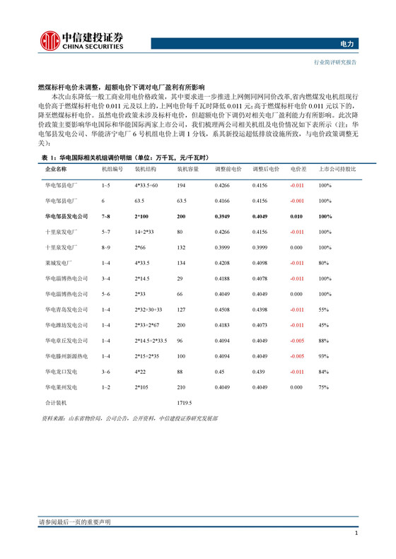 本次山東降低一般工商業(yè)用電價(jià)格政策,其中要求進(jìn)一步推進(jìn)上網(wǎng)側(cè)同網(wǎng)同價(jià)改革,省內(nèi)燃煤發(fā)電機(jī)組現(xiàn)行電價(jià)高于燃煤標(biāo)桿電價(jià) 0.011 元及以上的,上網(wǎng)電價(jià)每千瓦時(shí)降低 0.011 元;高于燃煤標(biāo)桿電價(jià) 0.011 元以下的,降至燃煤標(biāo)桿電價(jià)。 雖然電價(jià)政策未涉及標(biāo)桿電價(jià),但超額電價(jià)下調(diào)仍對(duì)相關(guān)電廠盈利能力有所影響。此次降價(jià)政策主要影響華電國(guó)際和華能國(guó)際兩家上市公司,我們梳理兩公司相關(guān)機(jī)組及電價(jià)情況如下表所示(注:華電鄒縣發(fā)電公司、華能濟(jì)寧電廠 6 號(hào)機(jī)組電價(jià)上調(diào) 1 分錢,系其新投運(yùn)超低排放設(shè)施所致,與電價(jià)政策調(diào)整無關(guān)):