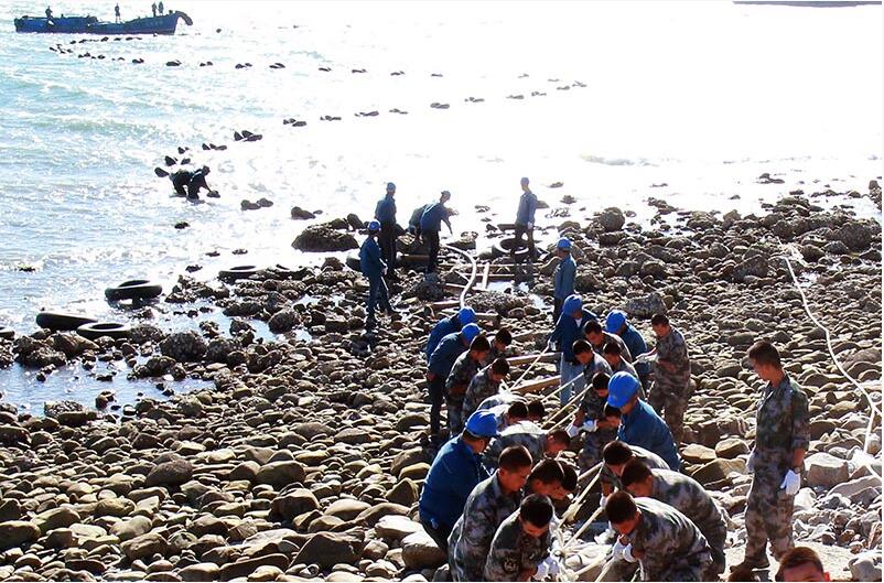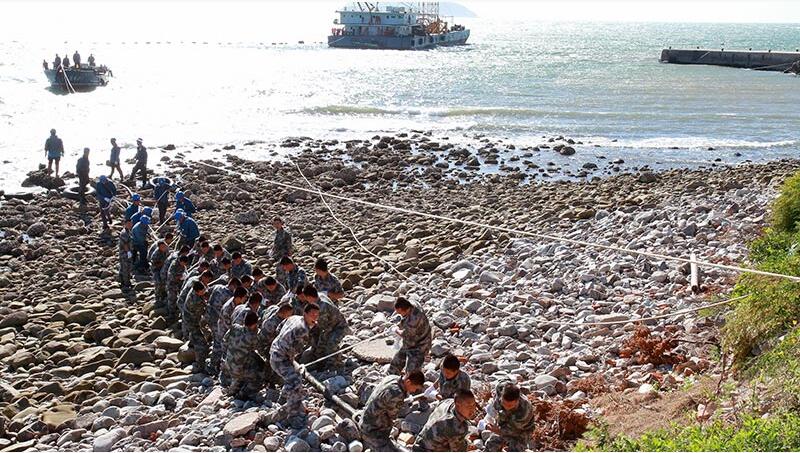 山東長(zhǎng)島縣供電員工和駐島官兵在拖運(yùn)敷設(shè)心得海底電纜。