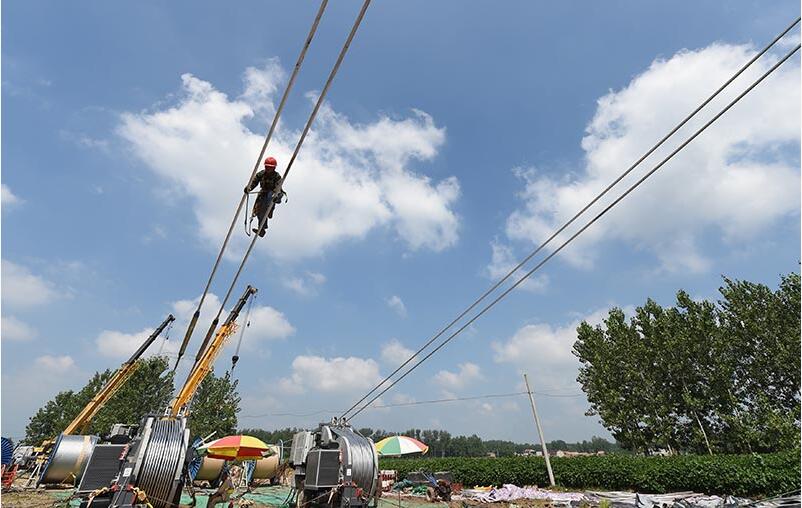 【背景】 在江蘇漣水縣五港鎮(zhèn),江蘇省送變電公司施工人員正在錫盟—泰州±800千伏直流特高壓工程蘇2標(biāo)段N6997號張力場施放導(dǎo)線?!?/div>
