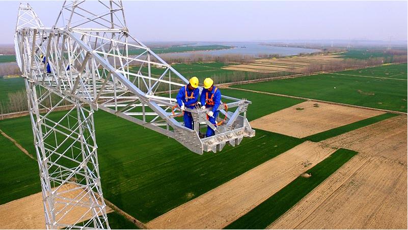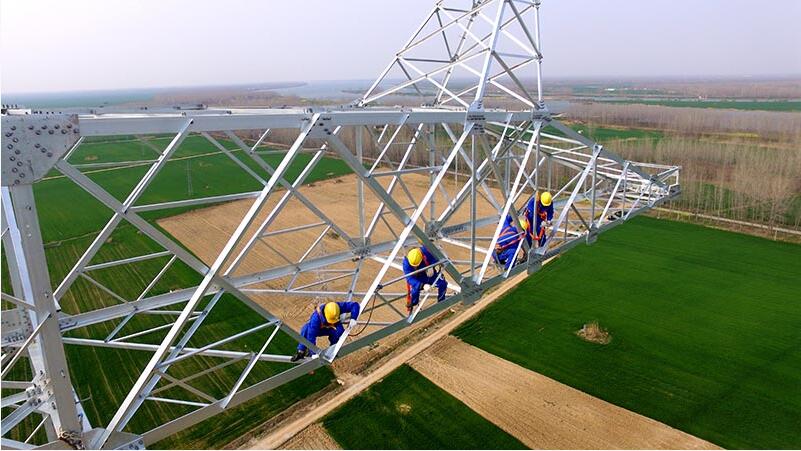 【背景】 在山西晉北至江蘇南京±800千伏特高壓直流輸電線路蘇1標(biāo)段立塔施工現(xiàn)場(chǎng),江蘇省送變電公司施工人員登上百米高空對(duì)已