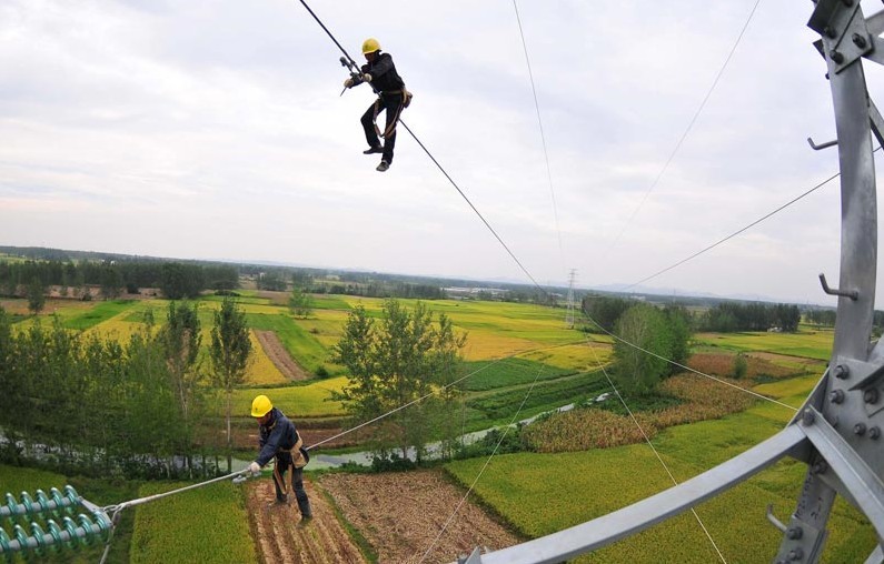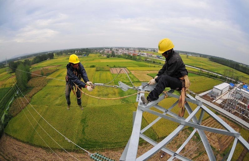 2013年9月28日,在安徽省滁州市定遠縣永康鎮(zhèn)光明村,電力工人在50多米的高空對輸電線路進行檢修,確保全市工農(nóng)業(yè)生產(chǎn)用電。當日,安徽省滁州市供電公司利用“國慶”節(jié)前部分企業(yè)放假、電力負荷較輕的有利時機,組織800多名技術人員對全市94條重要電力線路進行檢修,確保滁州電網(wǎng)安全穩(wěn)定運行,為“國慶”期間全市工農(nóng)業(yè)生產(chǎn)和城鄉(xiāng)居民秋冬季提供可靠供電。
