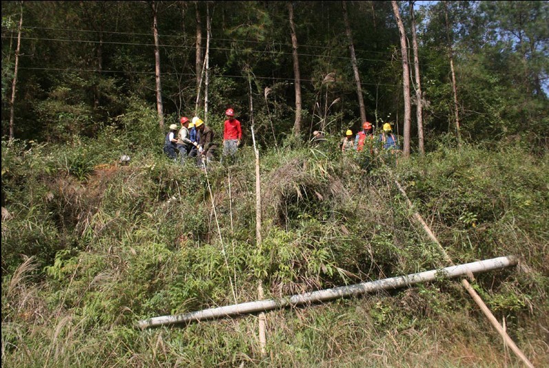 龍山縣電力公司寶塔供電二所員工正在該縣白羊鄉(xiāng)大山深處(寶白線山后支021- 75- 76處以及021-048- 11= 12處)進行安全隱患整改,整改過程中,他們克服山高、路難、環(huán)境惡劣等重重困難,堅持標準化作業(yè);公司2名
