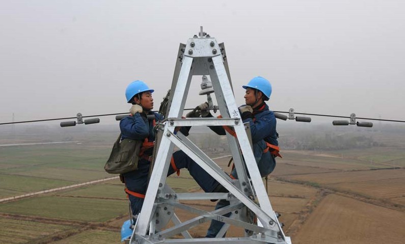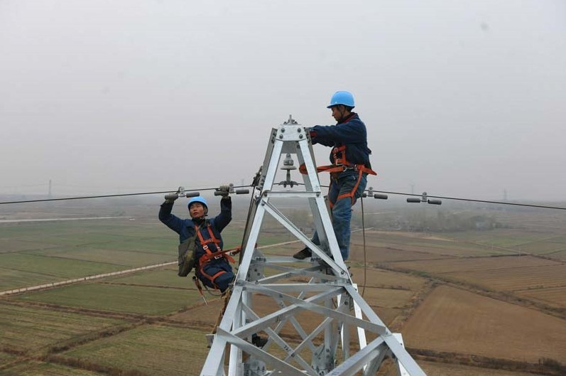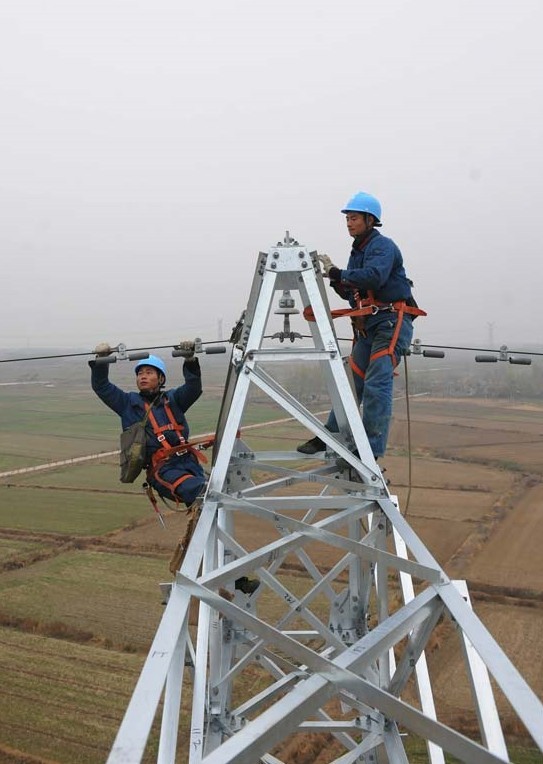 在安徽省定遠(yuǎn)縣池河鎮(zhèn)劉鋪村,國(guó)家電網(wǎng)安徽滁州供電公司的電力工人在50多米的高空冒著細(xì)雨進(jìn)行架線作業(yè)。當(dāng)日,隨著鳳(陽(yáng))定(遠(yuǎn))2858輸電線路的最后一根架空導(dǎo)線架設(shè)完成,安徽省滁州電網(wǎng)迎峰度冬7號(hào)工程—