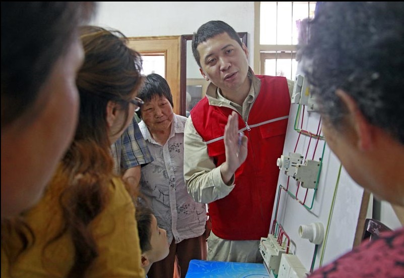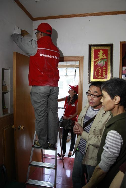清涼一社區(qū)是江蘇常州市內(nèi)較老的社區(qū),房屋普遍面積小、陳舊,而且老年人特別多。在一次搶修過(guò)程中,常州供電公司配電搶修班發(fā)現(xiàn)這個(gè)小區(qū)報(bào)修情況特別多,且里面失獨(dú)、鰥寡、殘疾老人這類特殊群體較為龐大,于是在2011年底配電工區(qū)黨支部與該社區(qū)結(jié)對(duì),志愿者定期上門服務(wù),平均每月至少一次。重陽(yáng)節(jié)的時(shí)候送年糕、端午節(jié)的時(shí)候送粽子,平日里維修線路、修理水龍頭、給老人買禮物……這不,天氣悶熱的上午,志愿者們又出動(dòng)啦!