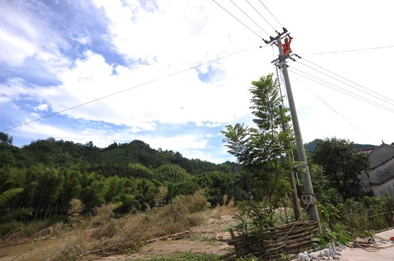在現(xiàn)場(chǎng),我們看到了旌德供電公司副總經(jīng)理周鵬,曬得黝黑的臉龐,干裂的嘴唇。根據(jù)領(lǐng)導(dǎo)分片帶隊(duì)的安排,從6月30日下午開(kāi)始,他就在祥云村協(xié)調(diào)指揮搶修。據(jù)他介紹,7月1日受損道路暢通之后,搶修需要的電桿、變壓器、導(dǎo)線等物資已經(jīng)全部運(yùn)輸?shù)轿唬?日的任務(wù)就是把祥云10千伏107主干線路全線架通,含宣城陽(yáng)光公司共4支施工隊(duì)伍分布在祥云村的5個(gè)臺(tái)區(qū)。他指著電桿告訴我們,洪災(zāi)襲擊后,原有河道旁的電力通道不能使用,采用將10千伏線路與380伏線路同桿架設(shè)、沿著公路等方式立桿架線。