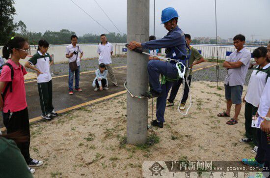 在活動最后,同學(xué)們來到欽州配電專業(yè)實訓(xùn)場,親身體驗了一回電力工人的工作。“高壓電十分危險,這要求我們在工作中要嚴(yán)格按照操作規(guī)范進行,才能保證自身的安全。”實訓(xùn)場的示范教員逐一向同學(xué)們介紹各種專業(yè)防護工具。在學(xué)習(xí)了基本的防護知識后,同學(xué)們體驗了開關(guān)閉合、爬電線桿等項目。