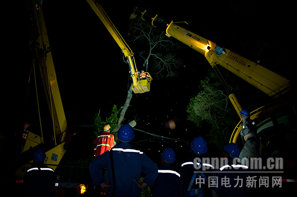 18時左右,市政園林管理局人員接電后迅速趕到現(xiàn)場。梧州供電局在做好各項(xiàng)現(xiàn)場安全措施后,確定現(xiàn)場分工。由市政園林管理局人員負(fù)責(zé)高空清砍樹木,供電局人員做好現(xiàn)場指揮和安全監(jiān)管。只見,市政園林管理局工作人員帶上電鋸,登上21米的高空車,用鋼絲繩捆綁樹木,從上到下一截一截的開鋸,在場的工作人員不顧夜晚的飛蛾撲面。經(jīng)過1個多小時緊張有序的清砍處理后,20時24分線路得到恢復(fù)供電。
