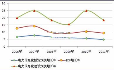 圖表1:2006-2011年中國(guó)GDP與電力信息化產(chǎn)業(yè)關(guān)聯(lián)性對(duì)比圖(單位:%)