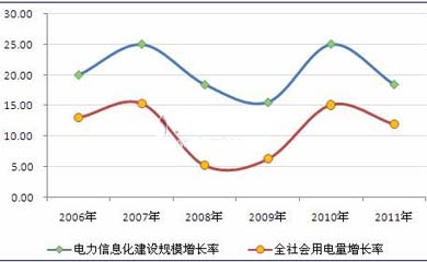 圖表2:2006-2011年電力需求與電力信息化產(chǎn)業(yè)關(guān)聯(lián)性對(duì)比圖(單位:%)