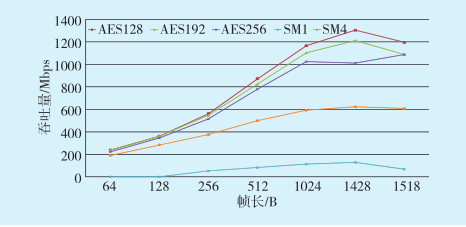 圖5 不同加密算法條件下量子VPN的吞吐量測試結(jié)果Fig.5 Test results of quantum VPN throughput under different encryption algorithms