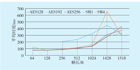 圖6 不同加密算法條件下量子VPN的平均時延測試結(jié)果Fig.6 Test results of quantum VPN average delay under different encryption algorithms