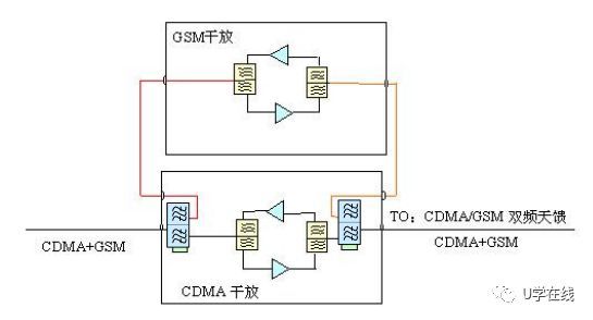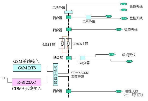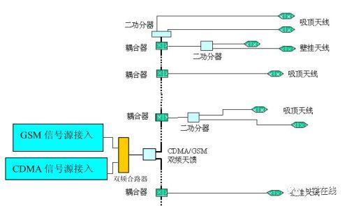 通過雙頻合路器把 CDMA 信號和 GSM 信號和為一路接入同一天饋系統(tǒng),實現(xiàn)CDMA 與 GSM 的雙網(wǎng)覆蓋。如下圖所示:
