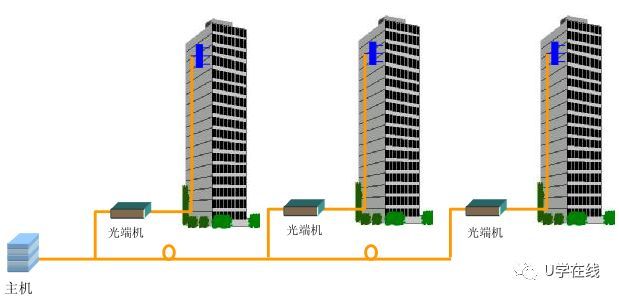 光纖分布系統(tǒng)是采用光纖作為傳輸介質,由覆蓋端機(主單元、接口單元)、遠端覆蓋單元、天線、光分/合路器件組成。由于光纖損耗小,適合于長距離傳輸,該系統(tǒng)廣泛應用于大型寫字樓、酒店、地下隧道、居民樓等室內覆蓋系統(tǒng)的建設。如下圖: