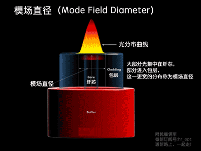 大部分光集中在纖芯,部分進(jìn)入包層,這一更寬的分布稱為模場(chǎng)直徑。