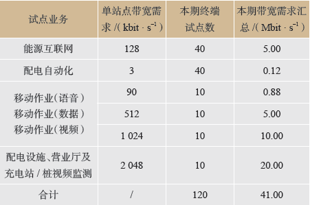128 kbit/s計算,配電自動化按照3 kbit/s計算,移動作業(yè)按照語音90 kbit/s、數(shù)據(jù)512 kbit/s、視頻1 024 kbit/s計算,配電設(shè)施、營業(yè)廳及充電站/樁視頻監(jiān)測按照2 048 kbit/s計算。業(yè)務(wù)帶寬需求見