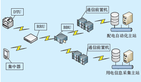 RRU及天線通常部署在柱上開關(guān)、臺變或環(huán)網(wǎng)柜旁,核心網(wǎng)設(shè)備部署在縣局或市局控制中心。無線終端CPE通過有線方式(串口或以太網(wǎng)口)連接集中器、配電自動化終端等。射頻拉遠技術(shù)原理及應(yīng)用示意如圖2所示。