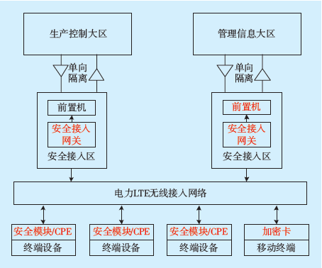 生產(chǎn)控制大區(qū)和管理信息大區(qū)的業(yè)務(wù)系統(tǒng)在與其終端的連接中使用電力LTE無線網(wǎng)絡(luò)或公用網(wǎng)絡(luò)等進行通信的,應(yīng)設(shè)立安全接入?yún)^(qū),接入生產(chǎn)控制大區(qū)的安全接入?yún)^(qū)應(yīng)包含物理隔離部件、前置機和加密認證設(shè)備等,接入管理信息大區(qū)的安全接入?yún)^(qū)應(yīng)包含安全接入平臺和加密認證設(shè)備等。