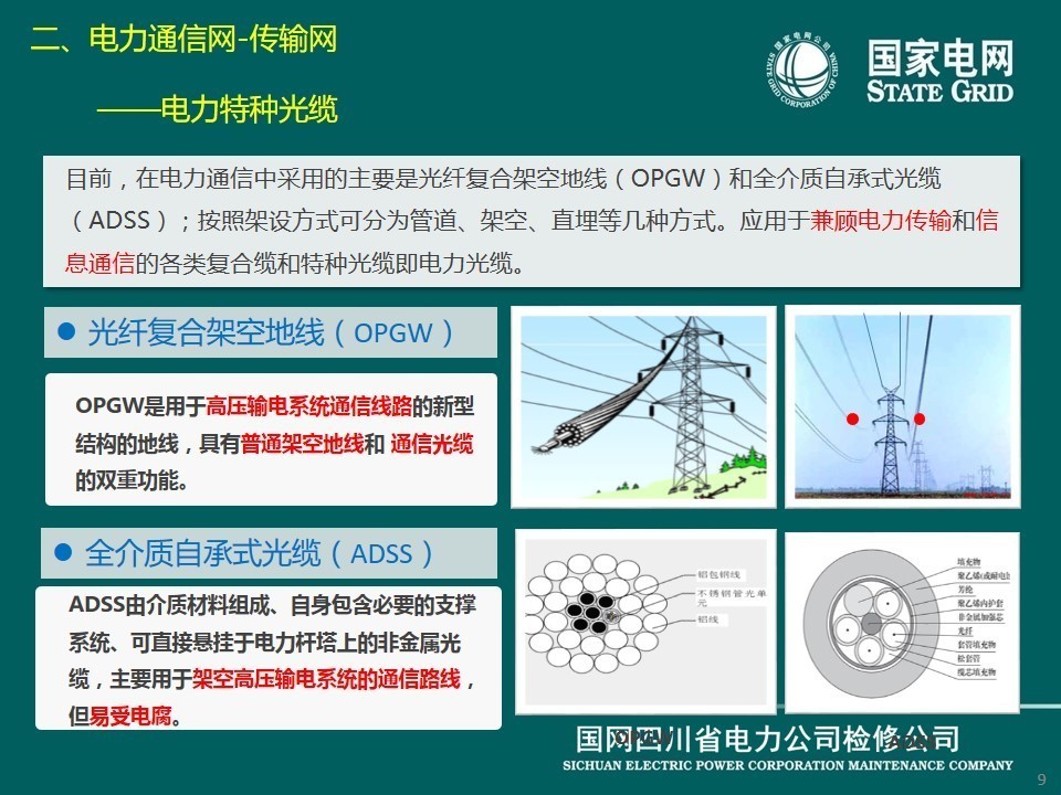 目前,在電力通信中采用的主要是光纖復(fù)合架空地線(xiàn)(OPGW)和全介質(zhì)自承式光纜(ADSS);按照架設(shè)方式可分為管道、架空、直埋等幾種方式。