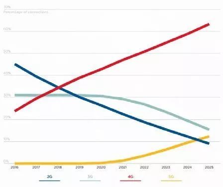 圖1 無線網(wǎng)絡(luò)發(fā)展曲線預(yù)測(cè)(來源:GSMA,2017)