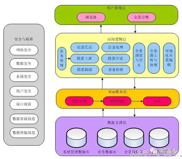 在橫向上,基于全景的輸電線路可視化運維管理需要滿足安全與標準體系的要求,包括數(shù)據(jù)存儲與傳輸規(guī)范、接口規(guī)范、網(wǎng)絡(luò)安全、數(shù)據(jù)安全、系統(tǒng)安全、用戶安全等(圖1為基于全景的輸電線路可視化運維管理的總體框架)。