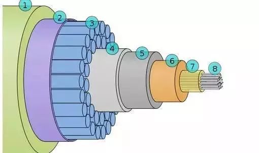 海底光纜與陸地光纜一樣,中間是頭發(fā)絲大小的纖芯,不過,海底光纜需更為加強的鎧裝保護。從外到內(nèi)分為:聚乙烯層、聚酯樹脂、鋼絞線層、鋁制防水層、碳酸樹脂層、銅管、石蠟、烷烴層,最后才到光纖。