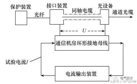 為查明原因,筆者進(jìn)行了相關(guān)試驗(yàn)。如圖4所示,用直流電流輸出裝置在通信機(jī)房的環(huán)形等電位接地網(wǎng)中通入試驗(yàn)電流,測(cè)量接口裝置屏的接地引下線(xiàn)與光設(shè)備屏的接地引下線(xiàn)之間的電壓U,當(dāng)電壓U達(dá)到1.7V左右時(shí),保護(hù)裝置發(fā)生通道異常。這說(shuō)明當(dāng)?shù)鼐W(wǎng)中流過(guò)電流時(shí),確實(shí)會(huì)引起保護(hù)裝置通道異常[3]。
