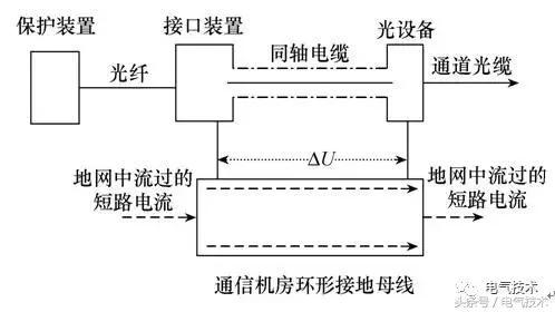 如圖3所示,當(dāng)線路接地時(shí),變電站地網(wǎng)中將流過(guò)接地電流,當(dāng)此電流通過(guò)通信機(jī)房?jī)?nèi)的環(huán)形等電位接地網(wǎng)時(shí),會(huì)在環(huán)形等電位接地網(wǎng)上產(chǎn)生壓降?U,而通信機(jī)房?jī)?nèi)的光設(shè)備屏和接口裝置屏之間的同軸電纜的屏蔽層是通過(guò)各自的屏柜接到環(huán)形接地母線上的,因此該?U實(shí)際上是加到了同軸電纜的屏蔽層上。同軸電纜的屏蔽層,是有為信號(hào)提供電氣通路的功能的,疊加?U后,將可能導(dǎo)致通信信號(hào)發(fā)生畸變,使通道發(fā)生異常。