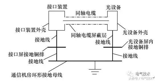 接口裝置到光設(shè)備之間同軸電纜屏蔽層的接地方式如圖2所示。從圖中可以看出,同軸電纜的屏蔽層分別接在接口裝置和光設(shè)備的外殼,然后通過(guò)接地線接到屏內(nèi)的接地銅排,再經(jīng)接地銅排接到機(jī)房?jī)?nèi)的環(huán)形接地母線上接地。