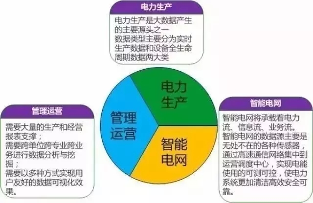 當(dāng)然,電力大數(shù)據(jù)遠(yuǎn)不止于上述所描述的這幾點(diǎn)方向,電力大數(shù)據(jù)主要來源于電力生產(chǎn)和電能使用的發(fā)電、輸電、變電、配電、用電和調(diào)度各個(gè)環(huán)節(jié),可大致分為三類:一是電網(wǎng)運(yùn)行和設(shè)備檢測(cè)或監(jiān)測(cè)數(shù)據(jù);二是電力企業(yè)營銷數(shù)據(jù),如交易電價(jià)、售電量、用電客戶等方面數(shù)據(jù);三是電力企業(yè)管理數(shù)據(jù)。
