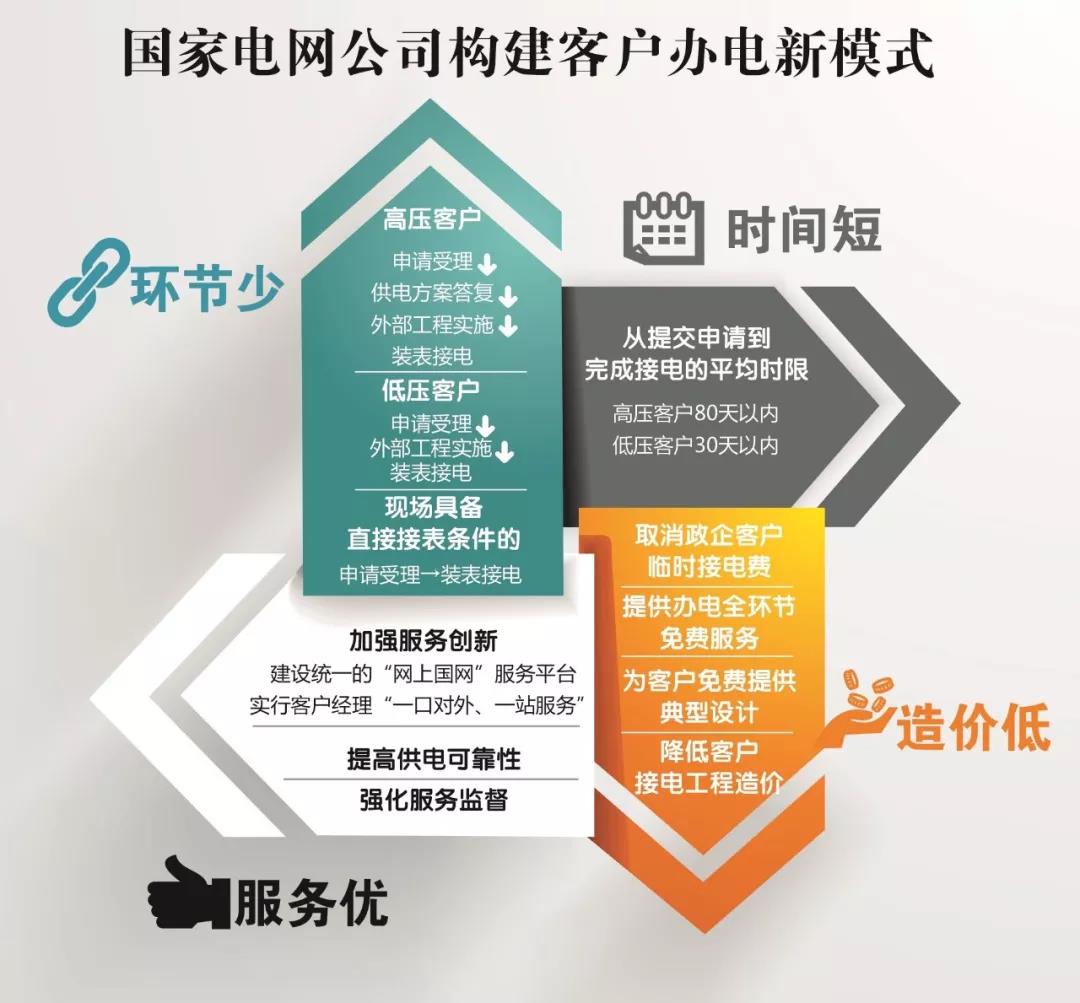 與以往相比,供電企業(yè)精簡了要求客戶參與的協(xié)商設(shè)計、商量供電方案以及涉及政府部門的審批、許可等環(huán)節(jié),取消內(nèi)部工程圖紙審核、中間檢查等環(huán)節(jié),讓這些步驟全部由供電企業(yè)負責(zé),不需客戶上門確認和親自參與政府部門審批,為客戶節(jié)省了大量時間。另外,政府提高工作效率和服務(wù)質(zhì)量的各項措施,也為供電企業(yè)盡快辦理客戶申請業(yè)務(wù)提供了便利。
