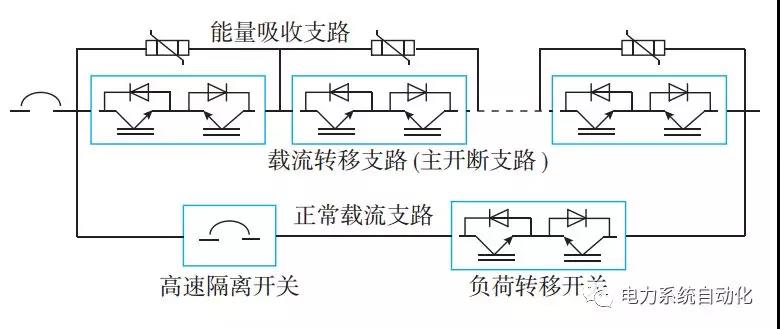 發(fā)生上述故障的概率是不可忽略不計的,因為在適用于特高壓直流電網(wǎng)的混合式直流斷路器中,需要串聯(lián)多個如圖2所示的開斷模塊,而每個開斷模塊中又含有多個串聯(lián)的分元件,若其中的某一分元件出故障,均有可能導(dǎo)致在開斷直流網(wǎng)絡(luò)短路電流的過程中,出現(xiàn)電子元器件因局部過電壓被擊穿的問題。譬如,如果圖2所示的載流轉(zhuǎn)移支路中的某一分元件因故障不能正常導(dǎo)通分流,則負(fù)荷轉(zhuǎn)移開關(guān)很可能被自身關(guān)斷過程中出現(xiàn)的截流過電壓擊穿,從而導(dǎo)致高速隔離開關(guān)也不能正常打開;即使上述過程沒出問題,載流成功轉(zhuǎn)移到圖2所示的主開斷支路后,如果主開斷支路在其斷流過程中部分元件出故障未同時關(guān)斷,也可能導(dǎo)致其余的分元件在其關(guān)斷過程中因分擔(dān)過高的截流過電壓而被擊穿。此外,高速隔離開關(guān)還可能因機械故障而不能打開,從而導(dǎo)致直流斷路器不能成功斷流。綜上所述,特高壓直流斷路器拒動或開斷直流電網(wǎng)短路電流不成功事件的概率,不像交流三相斷路器同時拒動事件的概率那樣可以忽略不計。