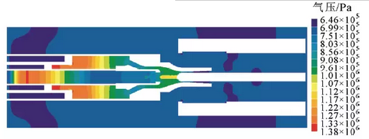 在開斷能力50kA斷路器的基礎(chǔ)上,對(duì)滅弧室結(jié)構(gòu)進(jìn)行優(yōu)化設(shè)計(jì)。綜合考慮分閘速度、壓氣室容積、噴口形狀及開斷電流等條件的影響,對(duì)斷路器開斷63kA短路電流過程中的氣體壓力進(jìn)行了仿真計(jì)算分析,氣壓分布見圖7,壓氣室和噴口處獲得了較高的、理想的氣壓。通過斷路器樣機(jī)進(jìn)行的性能驗(yàn)證試驗(yàn),對(duì)分閘速度、燃弧時(shí)間、燃弧區(qū)間、預(yù)擊穿時(shí)間等參數(shù)進(jìn)行了改進(jìn)設(shè)計(jì)。型式試驗(yàn)結(jié)果表明,研制的特高壓斷路器具有優(yōu)越的大短路電流開斷能力。