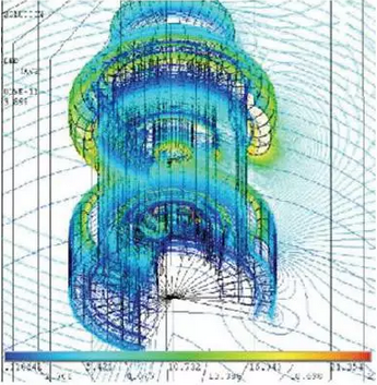 盆式絕緣子給高壓導(dǎo)體提供絕緣支撐并分割氣室,是特高壓GIS的關(guān)鍵絕緣部件。近年來開展了特高壓盆式絕緣子的國產(chǎn)化及質(zhì)量提升,通過分析盆式絕緣子產(chǎn)生缺陷的類型和原因,對(duì)盆式絕緣子進(jìn)行了結(jié)構(gòu)優(yōu)化設(shè)計(jì),電場分布如圖10,應(yīng)力分布如圖11所示。對(duì)生產(chǎn)工藝進(jìn)行了完善、調(diào)整,使得盆式絕緣子的機(jī)械和電氣綜合性能達(dá)到了較高的水平。從試驗(yàn)檢測方法(型式試驗(yàn)、材料試驗(yàn)、出廠試驗(yàn))和工藝控制(嵌件處理、澆注、固化工藝等)兩個(gè)方面提出了明確的質(zhì)量控制技術(shù)手段。尤其是提出了采用5支試品分別順序進(jìn)行若干項(xiàng)試驗(yàn),覆蓋生產(chǎn)、運(yùn)輸、運(yùn)行過程的各種工況,兼顧產(chǎn)品技術(shù)水平、綜合性能和工藝穩(wěn)定性的考核。大幅提升了特高壓盆式絕緣子的制造水平和質(zhì)量穩(wěn)定性,產(chǎn)品在皖電東送和浙福特高壓交流輸電工程得到了應(yīng)用。