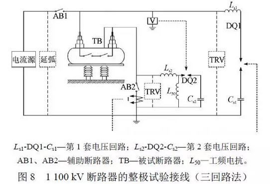 我國特高壓斷路器的短路開斷試驗(yàn)采用電流引入合成試驗(yàn)方法,試驗(yàn)時(shí)適當(dāng)調(diào)整電壓源的引入電流和頻率以滿足零區(qū)考核等價(jià)性的要求。當(dāng)額定電壓高于800kV時(shí),電流引入法的試驗(yàn)設(shè)備達(dá)到極限,不能滿足特高壓斷路器的整極試驗(yàn)要求。為此,提出了一種“三回路法”的合成試驗(yàn)回路,試驗(yàn)接線見圖8。在大電流階段,通過試品的電流由電流源提供,過零開斷前適當(dāng)時(shí)刻第1套電壓回路投入,被試斷路器中流過由電流源和第1套電壓回路共同提供的電流;試品過零開斷后,由第1套電壓回路在斷路器一端提供TRV起始的部分,在此TRV上升到一定階段時(shí),第2套電壓回路投入,同時(shí)施加在斷路器另一端與外殼,兩套電壓回路的電壓疊加,共同構(gòu)成施加在試品兩端的恢復(fù)電壓,且滿足對(duì)殼體的全電壓考核;回路切換中,應(yīng)確保電流零區(qū)的等價(jià)性要求。“三回路法”合成試驗(yàn)回路等價(jià)性好、安全性高,成功完成了1100kV斷路器的T100s和T100a的整機(jī)開斷試驗(yàn)。