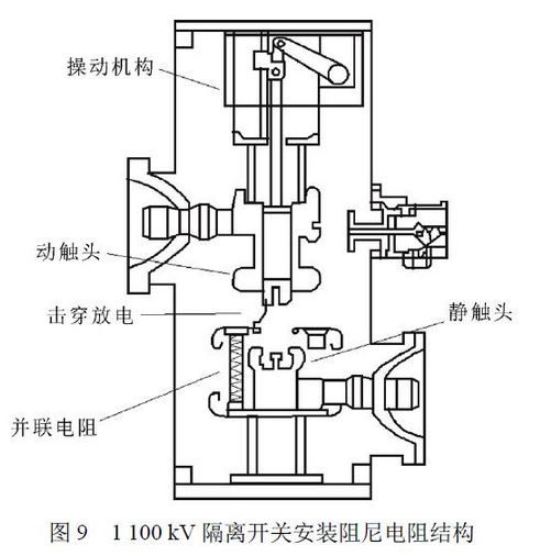 特高壓設(shè)備絕緣可靠性要求高,操作過電壓抑制更加重要,隔離開關(guān)操作引起的特快速瞬態(tài)過電壓(VFTO),具有幅值高、上升時(shí)間短和連續(xù)多次脈沖等特點(diǎn),對(duì)絕緣威脅較大,需采取合理措施限制。特高壓GIS隔離開關(guān)主要有兩種結(jié)構(gòu)型式。“立式”隔離開關(guān)操作速度較快,產(chǎn)生的VFTO幅值較高。“立式”隔離開關(guān)在靜觸頭側(cè)安裝VFTO阻尼電阻,如圖9所示,隔離開關(guān)分合閘過程中,阻尼電阻被串入放電回路,有效抑制觸頭間隙重復(fù)擊穿過程中的高頻振蕩,從而限制VFTO幅值和頻率。“臥式”隔離開關(guān)操作速度較慢,產(chǎn)生的VFTO幅值較低,未安裝阻尼電阻。