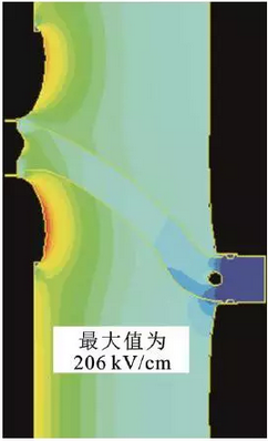 根據(jù)斷路器內(nèi)部結(jié)構(gòu),結(jié)合SF6、環(huán)氧樹脂、陶瓷等材質(zhì)不同介電常數(shù),建立了電場仿真模型,對(duì)絕緣特性進(jìn)行了分析計(jì)算,見圖6。滅弧室斷口的計(jì)算條件為一端施加2400kV雷電沖擊電壓,另一端施加反極性峰值為635kV的工頻電壓,即900kV,這是最為苛刻的條件。根據(jù)電場要求對(duì)產(chǎn)品結(jié)構(gòu)進(jìn)行優(yōu)化設(shè)計(jì),試驗(yàn)驗(yàn)證滿足了絕緣要求。