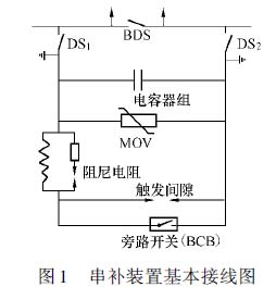 串聯(lián)電容補償裝置由電容器組、金屬氧化物變阻器(MOV)、放電間隙、阻尼電抗、旁路開關、絕緣平臺、保護和控制系統(tǒng)組成。串補裝置采用的是固定式裝置,其保護電容器的設備是MOV、分路間隙及旁路斷路器。該串補裝置的基本接線如圖1所示。