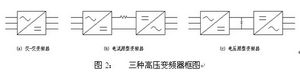 其中交—直—交變頻器又可根據(jù)直流環(huán)節(jié)采用大電感以平抑電流脈動的變頻器稱為電流源型變頻器,直流環(huán)節(jié)采用大電容抑制電壓波動的變頻器則稱為電壓源型變頻器。圖2所示為三種高壓變頻器框圖。