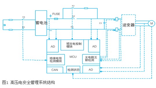 圖1為純電動(dòng)汽車高壓電安全管理系統(tǒng)結(jié)構(gòu),該系統(tǒng)實(shí)現(xiàn)的基本功能如下: