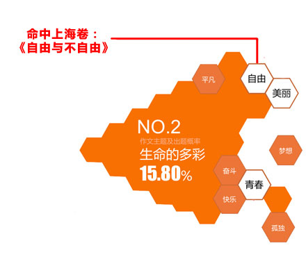 以上海市為例,2014年上海卷高考作文題為“自由與不自由”,在百度大數(shù)據(jù)預(yù)測(cè)的出題概率第二大作文主題“生命的多彩”中,恰好命中作文關(guān)鍵詞“自由”。