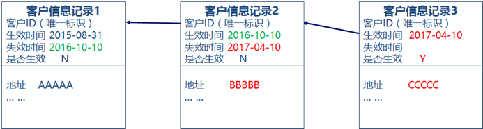 這種模式,我們?cè)趥鹘y(tǒng)的數(shù)據(jù)庫設(shè)計(jì)也會(huì)采用,例如下圖拉鏈表的形式,每次對(duì)數(shù)據(jù)的更新都采用追加( Insert而不是Update)模式,有起始時(shí)間、失效時(shí)間和是否生效標(biāo)識(shí),保持全部交易歷史。