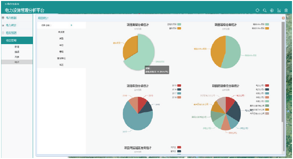 1)數據統(tǒng)計[9]。對導入的電網數據進行聚類分析,按項目類型、電壓等級、年份、供電區(qū)域等分別統(tǒng)計電網基礎信息和用戶信息。電力設施信息統(tǒng)計如圖5所示。