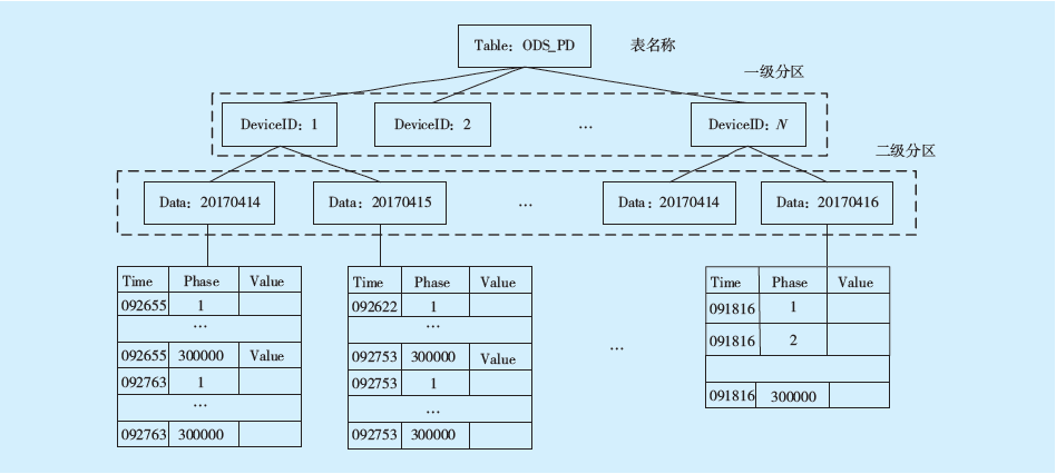 電力設備監(jiān)測數(shù)據(jù)的兩個最基本屬性是設備編號和數(shù)據(jù)采集時間。為了提升查詢和數(shù)據(jù)分析的性能,使用設備ID作為一級分區(qū),采集日期作為二級分區(qū),從而可以有效減少數(shù)據(jù)查詢的范圍,提升訪問性能。