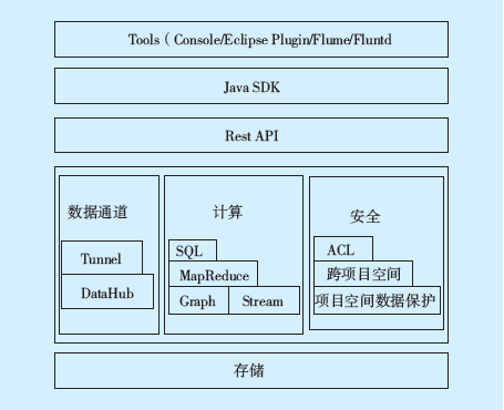 MaxCompute是阿里云提供的海量數(shù)據(jù)處理平臺,支持批量結(jié)構(gòu)化、非結(jié)構(gòu)化數(shù)據(jù)的存儲和計算,數(shù)據(jù)規(guī)??蛇_EB級別。MaxCompute目前已在電子商務網(wǎng)站的交易分析、企業(yè)數(shù)據(jù)倉庫和BI分析等領域得到廣泛應用。MaxCompute提供了數(shù)據(jù)上傳下載通道(Tunnel),以及SQL、MapReduce、Graph等多種計算服務接口。MaxCompute功能組件如圖1所示。