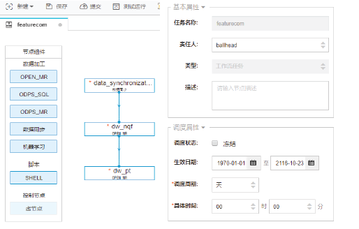 為了實現(xiàn)對監(jiān)測數(shù)據(jù)的統(tǒng)計特征計算,需要使用2個MapReduce任務來完成計算,并將計算任務串聯(lián)起來。為了完成任務串聯(lián)和任務調(diào)度的周期執(zhí)行,本文使用阿里云數(shù)加平臺的大數(shù)據(jù)開發(fā)套件來設計實現(xiàn)計算任務的工作流,并配置任務調(diào)度策略。特征計算的工作流和調(diào)度配置界面如圖8所示。
