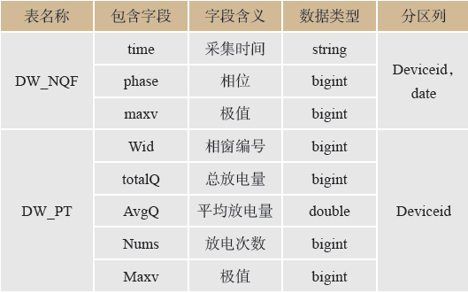 使用相同的SQL語法,依次創(chuàng)建基本參數(shù)表DW_NQF和放電譜圖表DW_PT,數(shù)據(jù)表字段描述見表1所列。