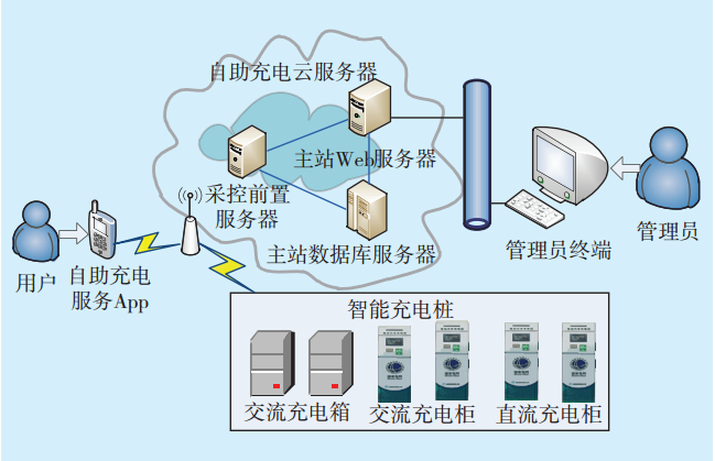 自助充電云服務(wù)器從物理組成上分為主站W(wǎng)eb服務(wù)器、主站數(shù)據(jù)庫(kù)服務(wù)器及采控前置服務(wù)器。主站W(wǎng)eb服務(wù)器與系統(tǒng)管理側(cè)相連,提供管理員對(duì)于充電業(yè)務(wù)的管控;主站數(shù)據(jù)庫(kù)服務(wù)器負(fù)責(zé)處理充電樁的負(fù)荷信息、用戶電量信息、電網(wǎng)負(fù)荷指令及地圖調(diào)用信息等;采控前置服務(wù)器通過(guò)無(wú)線傳輸與自助充電服務(wù)APP及智能充電樁連接,實(shí)現(xiàn)對(duì)系統(tǒng)各項(xiàng)數(shù)據(jù)的實(shí)時(shí)采集并傳輸充電業(yè)務(wù)的控制指令。